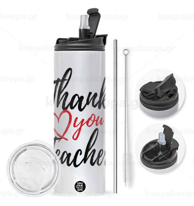 Thank you teacher, Travel Tumbler 2 Lids, with metal straw & cleaning brush (Stainless steel 304 Food grade, BPA free, 600ml)