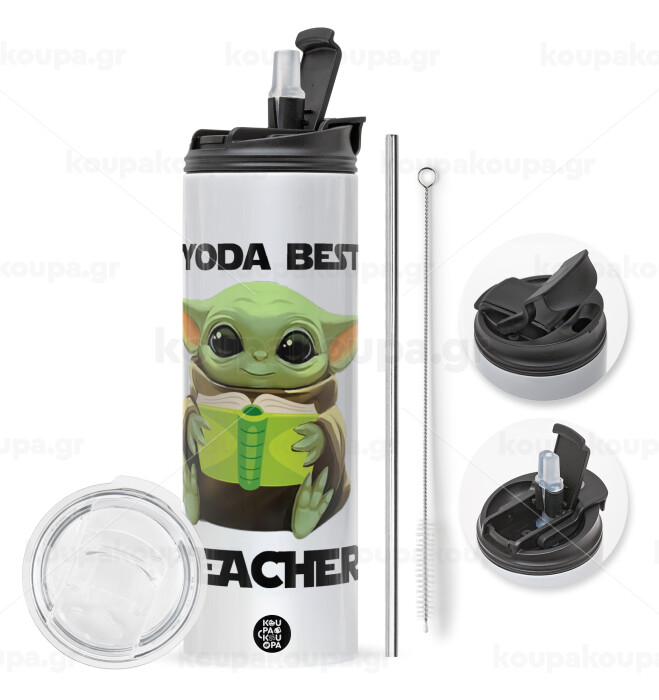 Yoda Best Teacher, Travel Tumbler 2 Lids, with metal straw & cleaning brush (Stainless steel 304 Food grade, BPA free, 600ml)