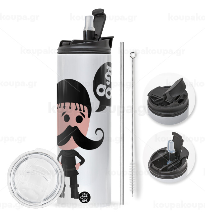 Κρητικός "Ξα σου", Travel Tumbler 2 Lids, with metal straw & cleaning brush (Stainless steel 304 Food grade, BPA free, 600ml)