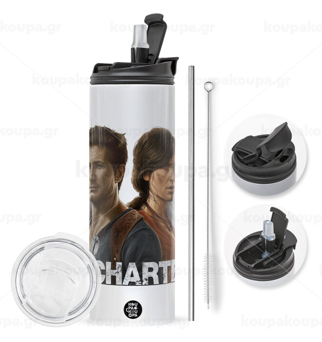 Uncharted, Travel Tumbler 2 Lids, with metal straw & cleaning brush (Stainless steel 304 Food grade, BPA free, 600ml)