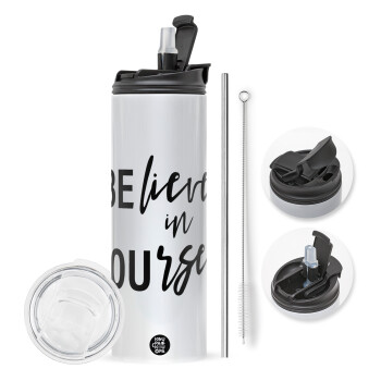Believe in your self, Travel Tumbler 2 Lids, with metal straw & cleaning brush (Stainless steel 304 Food grade, BPA free, 600ml)