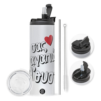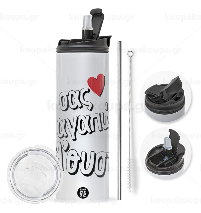 Σας αγαπώ όλ'ουστ!, Travel Tumbler 2 Lids, with metal straw & cleaning brush (Stainless steel 304 Food grade, BPA free, 600ml)