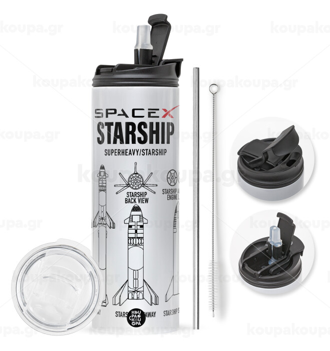 Space X, Travel Tumbler 2 Lids, with metal straw & cleaning brush (Stainless steel 304 Food grade, BPA free, 600ml)