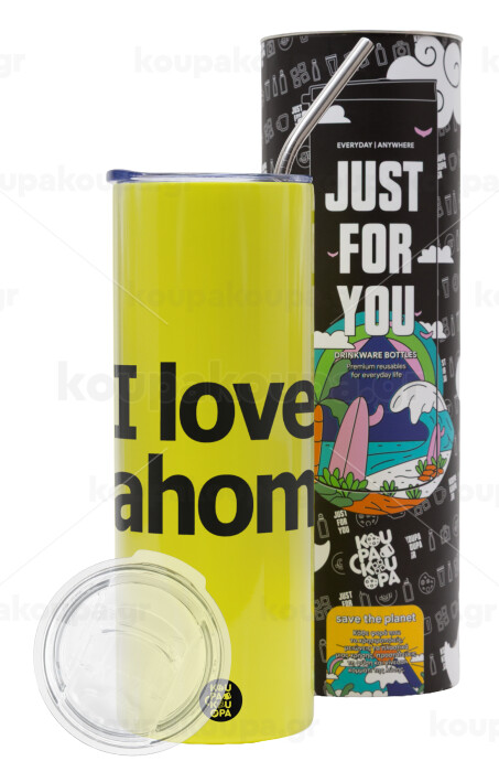 I love Tahoma, Neon Yellow Travel Tumbler, with metal straw (Stainless steel 304 Food grade, BPA free, 600ml)