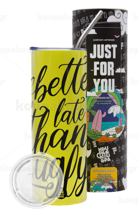 Better late than ugly, Neon Yellow Travel Tumbler, with metal straw (Stainless steel 304 Food grade, BPA free, 600ml)