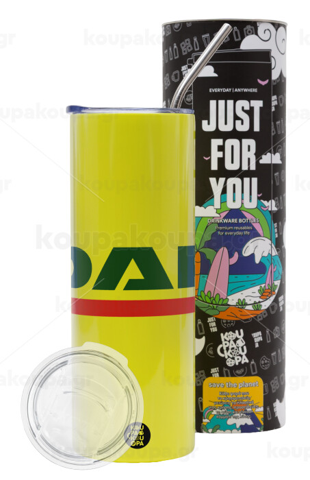 DAF, Neon Yellow Travel Tumbler, with metal straw (Stainless steel 304 Food grade, BPA free, 600ml)