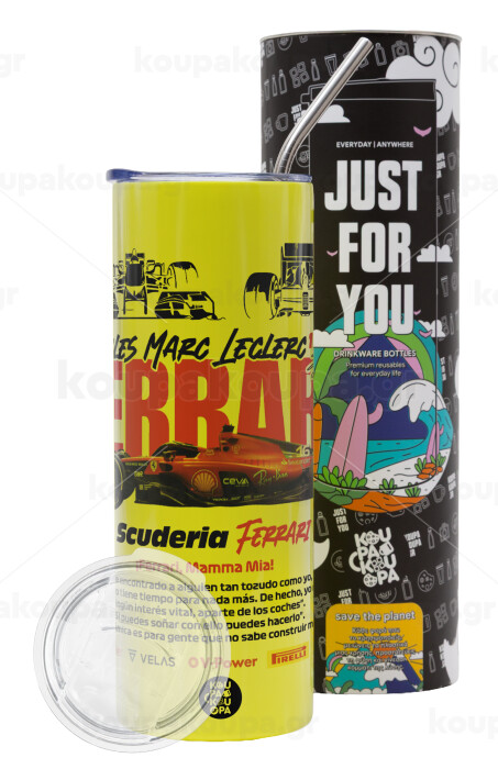 F1 Ferrari, Neon Yellow Travel Tumbler, with metal straw (Stainless steel 304 Food grade, BPA free, 600ml)
