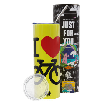 I love Bike, Neon Yellow Travel Tumbler, with metal straw (Stainless steel 304 Food grade, BPA free, 600ml)