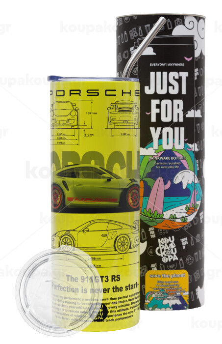 Porsche, Neon Yellow Travel Tumbler, with metal straw (Stainless steel 304 Food grade, BPA free, 600ml)