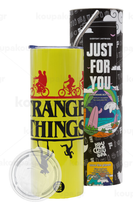 Stranger Things upside down, Neon Yellow Travel Tumbler, with metal straw (Stainless steel 304 Food grade, BPA free, 600ml)