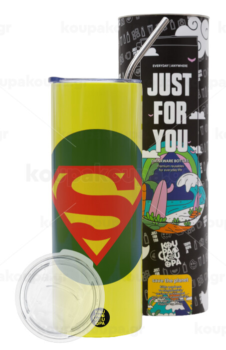 Superman, Neon Yellow Travel Tumbler, with metal straw (Stainless steel 304 Food grade, BPA free, 600ml)