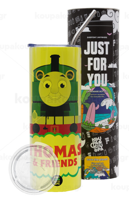Τόμας το τρενάκι, Neon Yellow Travel Tumbler, with metal straw (Stainless steel 304 Food grade, BPA free, 600ml)