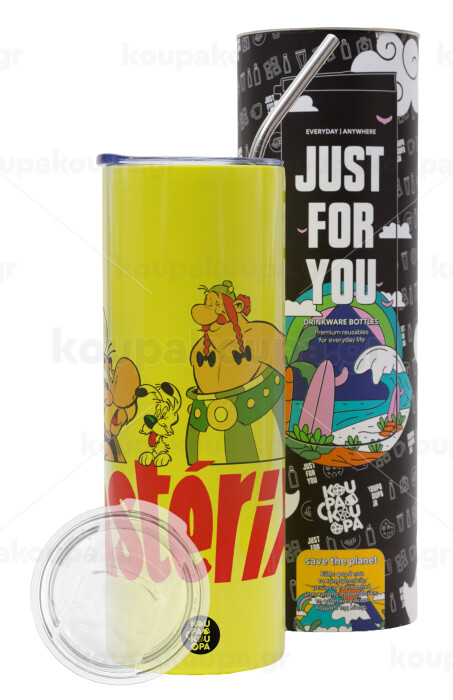 Asterix and Obelix, Neon Yellow Travel Tumbler, with metal straw (Stainless steel 304 Food grade, BPA free, 600ml)