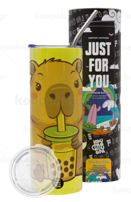 Capybara Bubble Tea, Neon Yellow Travel Tumbler, with metal straw (Stainless steel 304 Food grade, BPA free, 600ml)