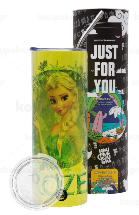 Frozen Elsa, Neon Yellow Travel Tumbler, with metal straw (Stainless steel 304 Food grade, BPA free, 600ml)