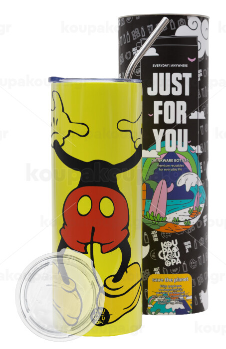 Mickey hide..., Neon Yellow Travel Tumbler, with metal straw (Stainless steel 304 Food grade, BPA free, 600ml)