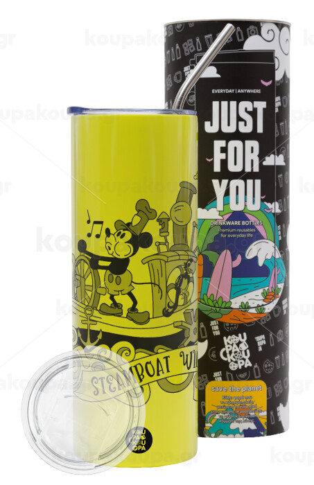 Mickey steamboat, Neon Yellow Travel Tumbler, with metal straw (Stainless steel 304 Food grade, BPA free, 600ml)