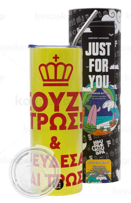 Σούζυ και ψεύδεσαι και τρως, Neon Yellow Travel Tumbler, with metal straw (Stainless steel 304 Food grade, BPA free, 600ml)