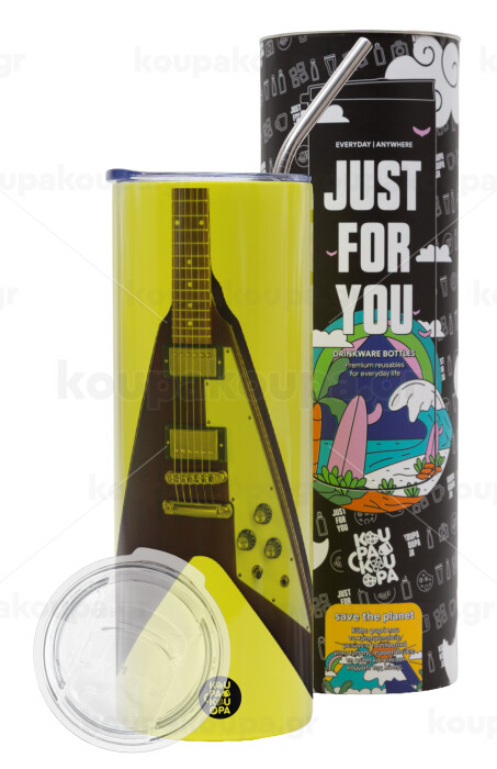 Guitar flying V, Neon Yellow Travel Tumbler, with metal straw (Stainless steel 304 Food grade, BPA free, 600ml)