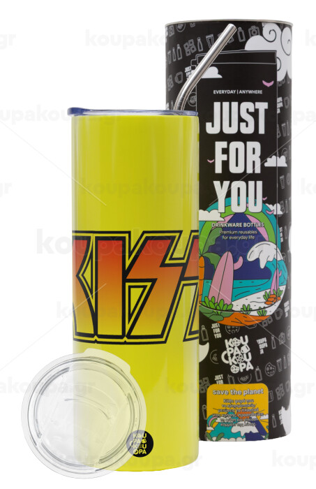 KISS, Neon Yellow Travel Tumbler, with metal straw (Stainless steel 304 Food grade, BPA free, 600ml)