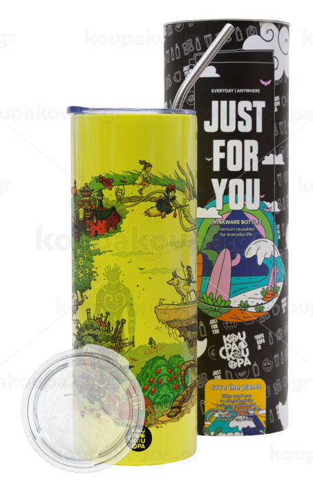 Στούδιο Γκίβλι, Neon Yellow Travel Tumbler, with metal straw (Stainless steel 304 Food grade, BPA free, 600ml)