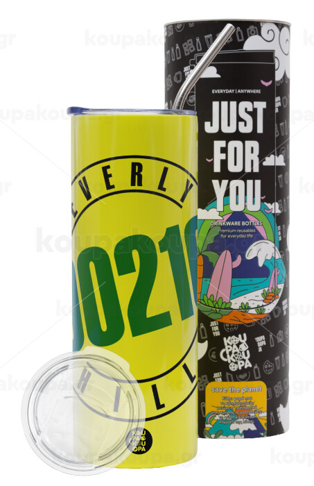 Beverly Hills, 90210, Neon Yellow Travel Tumbler, with metal straw (Stainless steel 304 Food grade, BPA free, 600ml)