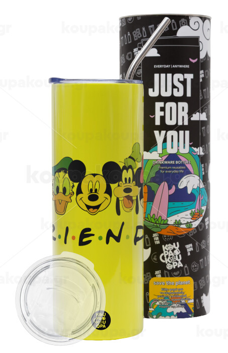 Friends characters, Neon Yellow Travel Tumbler, with metal straw (Stainless steel 304 Food grade, BPA free, 600ml)