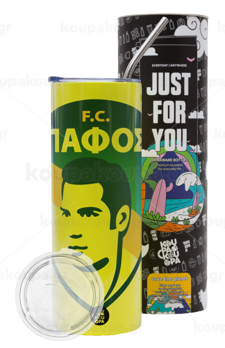 Πάφος FC, Neon Yellow Travel Tumbler, with metal straw (Stainless steel 304 Food grade, BPA free, 600ml)