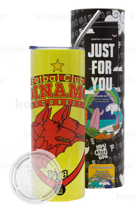 FC Dinamo Bucuresti, Neon Yellow Travel Tumbler, with metal straw (Stainless steel 304 Food grade, BPA free, 600ml)