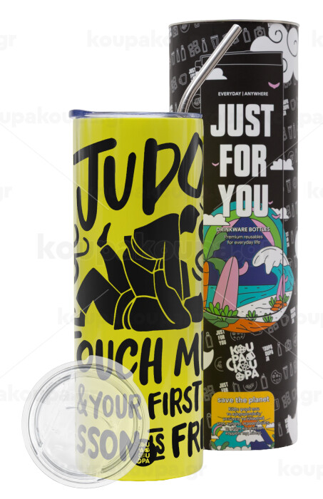 Judo Touch Me And Your First Lesson Is Free, Neon Yellow Travel Tumbler, with metal straw (Stainless steel 304 Food grade, BPA free, 600ml)