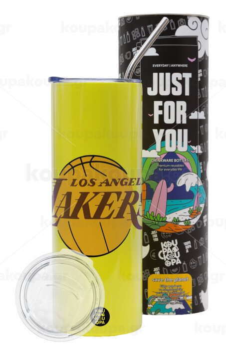 Lakers, Neon Yellow Travel Tumbler, with metal straw (Stainless steel 304 Food grade, BPA free, 600ml)