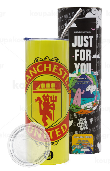Manchester United F.C., Neon Yellow Travel Tumbler, with metal straw (Stainless steel 304 Food grade, BPA free, 600ml)