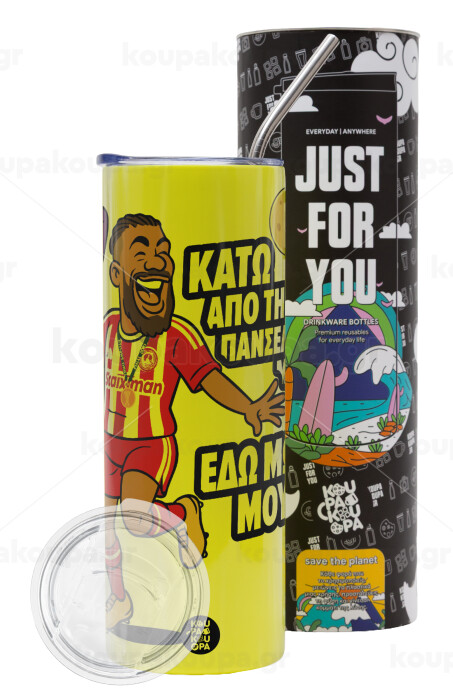 Ροντινέι, "ΚΑΤΩ ΑΠΟ ΤΗΝ ΠΑΝΣΕΛΗΝΟ ΜΟΥ!", Neon Yellow Travel Tumbler, with metal straw (Stainless steel 304 Food grade, BPA free, 600ml)