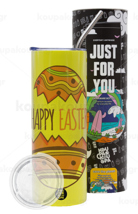 Happy easter egg, Neon Yellow Travel Tumbler, with metal straw (Stainless steel 304 Food grade, BPA free, 600ml)