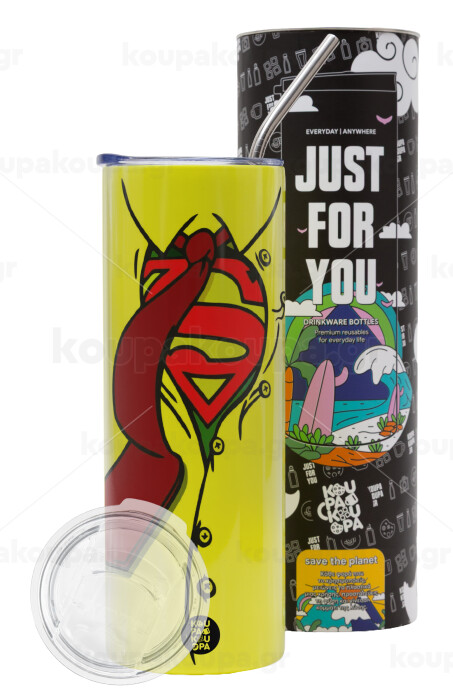 SuperDad, Neon Yellow Travel Tumbler, with metal straw (Stainless steel 304 Food grade, BPA free, 600ml)