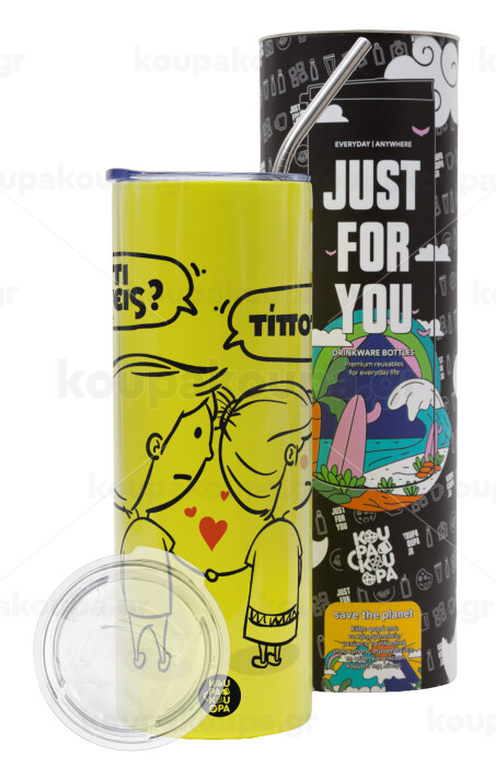Τι έχεις? Τίποτα!, Neon Yellow Travel Tumbler, with metal straw (Stainless steel 304 Food grade, BPA free, 600ml)
