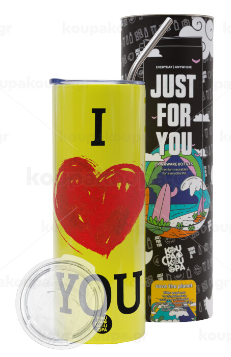 I Love You, Neon Yellow Travel Tumbler, with metal straw (Stainless steel 304 Food grade, BPA free, 600ml)
