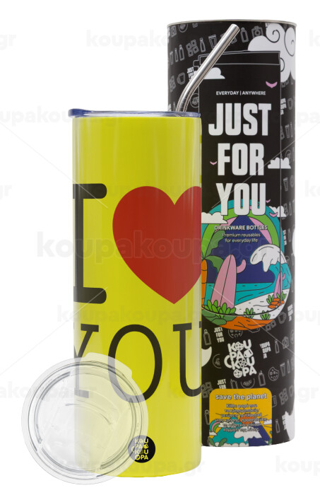 I Love you classic, Neon Yellow Travel Tumbler, with metal straw (Stainless steel 304 Food grade, BPA free, 600ml)