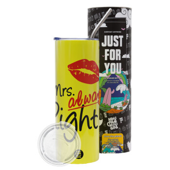 Mrs always right kiss, Neon Yellow Travel Tumbler, with metal straw (Stainless steel 304 Food grade, BPA free, 600ml)