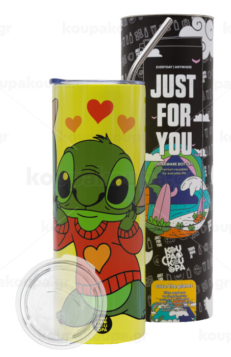 Stitch heart, Neon Yellow Travel Tumbler, with metal straw (Stainless steel 304 Food grade, BPA free, 600ml)