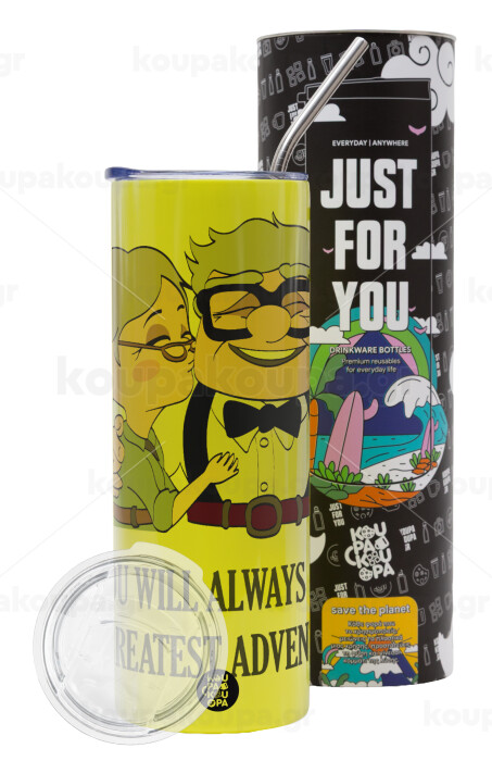 UP, YOU WILL ALWAYS BE MY GREATEST ADVENTURE, Neon Yellow Travel Tumbler, with metal straw (Stainless steel 304 Food grade, BPA free, 600ml)
