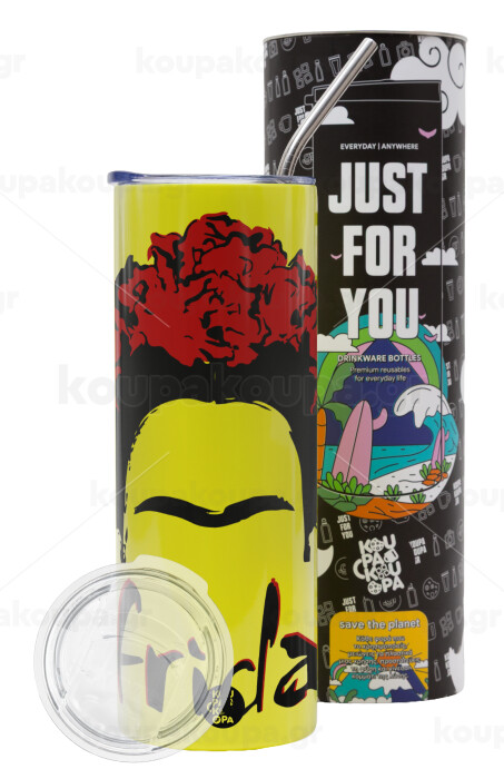 Frida, Neon Yellow Travel Tumbler, with metal straw (Stainless steel 304 Food grade, BPA free, 600ml)