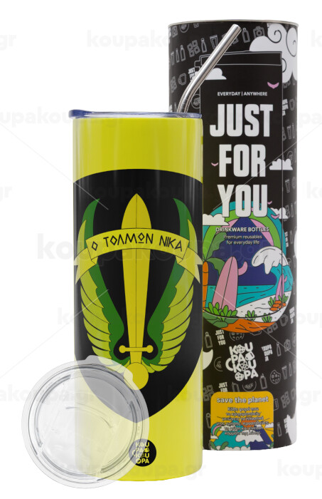 Έμβλημα Μονάδων Καταδρομών Ο Τολμων Νικα - Λοκ, Neon Yellow Travel Tumbler, with metal straw (Stainless steel 304 Food grade, BPA free, 600ml)