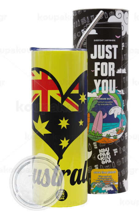 Australia flag, Neon Yellow Travel Tumbler, with metal straw (Stainless steel 304 Food grade, BPA free, 600ml)