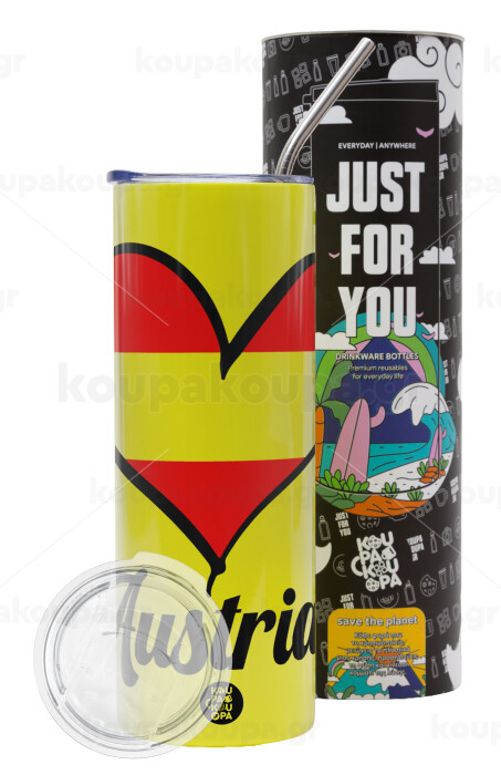 Austria flag, Neon Yellow Travel Tumbler, with metal straw (Stainless steel 304 Food grade, BPA free, 600ml)