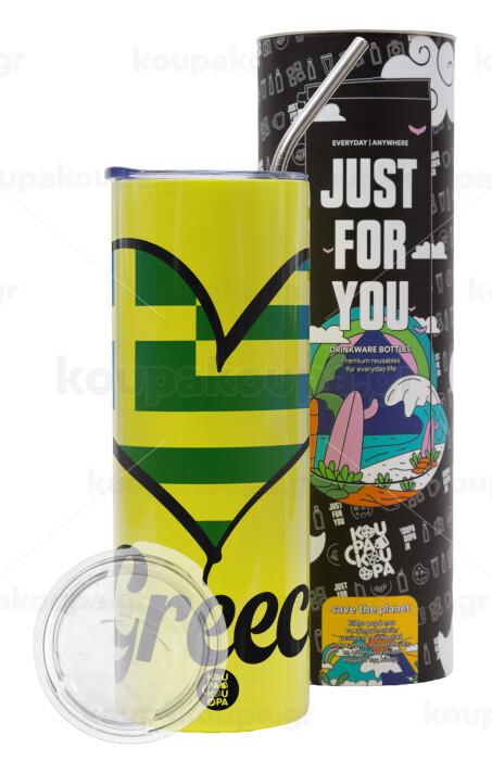 Greece flag, Neon Yellow Travel Tumbler, with metal straw (Stainless steel 304 Food grade, BPA free, 600ml)