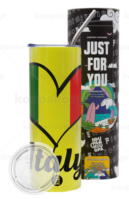 Italy flag, Neon Yellow Travel Tumbler, with metal straw (Stainless steel 304 Food grade, BPA free, 600ml)