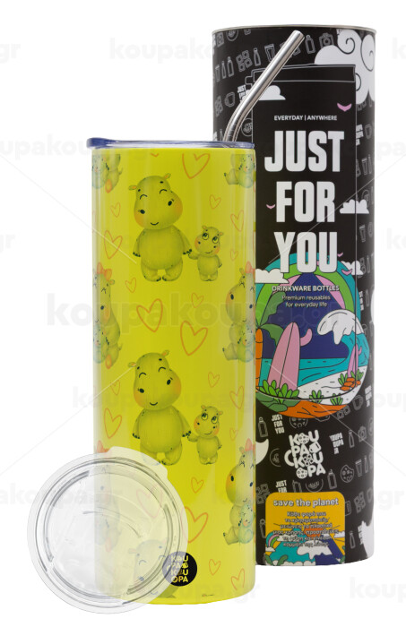 Hippo, Neon Yellow Travel Tumbler, with metal straw (Stainless steel 304 Food grade, BPA free, 600ml)