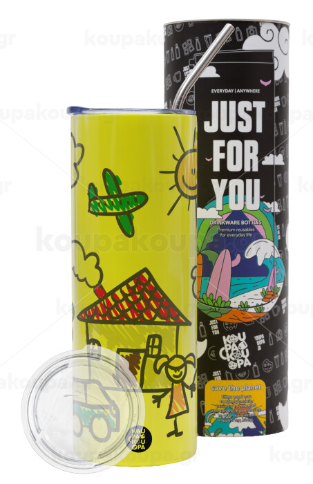 Children's drawing, Neon Yellow Travel Tumbler, with metal straw (Stainless steel 304 Food grade, BPA free, 600ml)