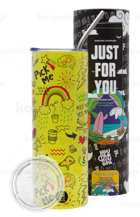 Doodle kids, Neon Yellow Travel Tumbler, with metal straw (Stainless steel 304 Food grade, BPA free, 600ml)